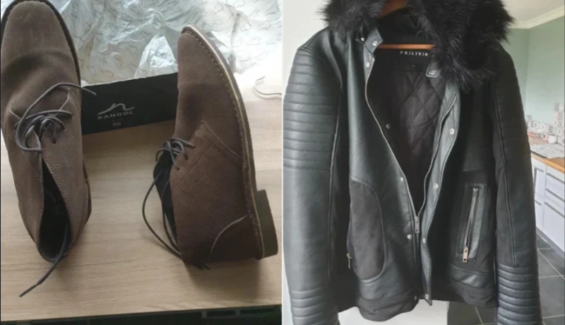 Blouson noir simili cuir avec fourrure synthétique,boutique officielle (sans étiquette) taille cintrée, Largeur 0,50,Longueur 0,60 (ne convient pas au personne trappu) ? Blouson à capuche hiver blanc (taille 46 marque for men) et Paire de chaussure en daim de marke Kangol taille 44 (porté une fois)